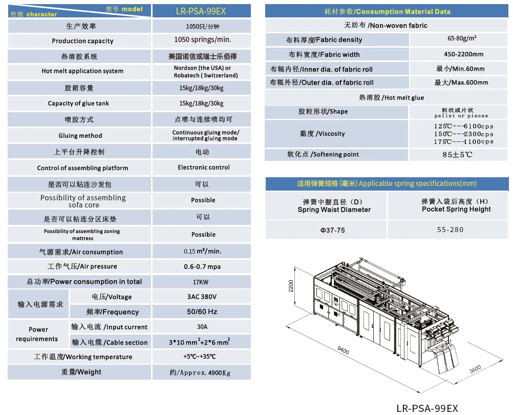 2. 专利双入料系统,弹簧条从双侧入料,入料口即完成喷胶,生产效率高,采用了双排并行推进技术